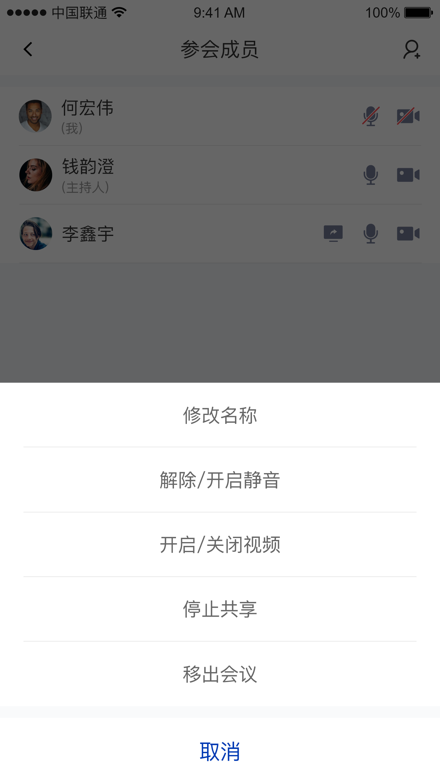 | 主持人的参会成员页面 | 主持人操作弹窗 | 普通成员的参会成员页面 |