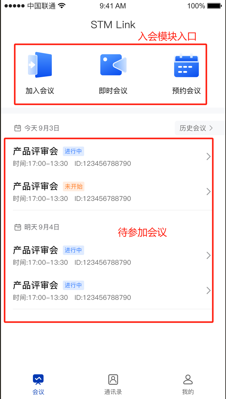 | 待参加会议页面 | 历史会议页面 |